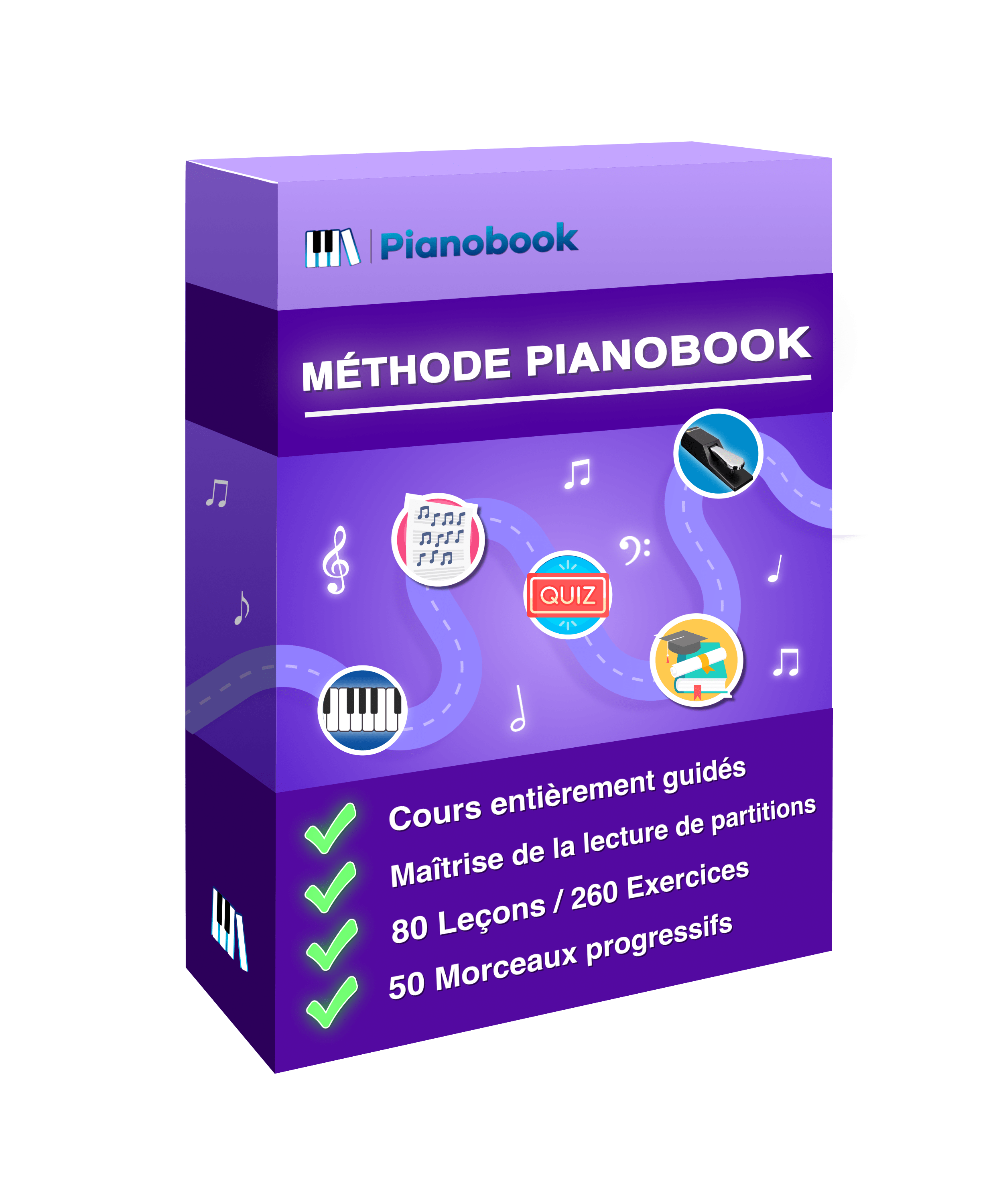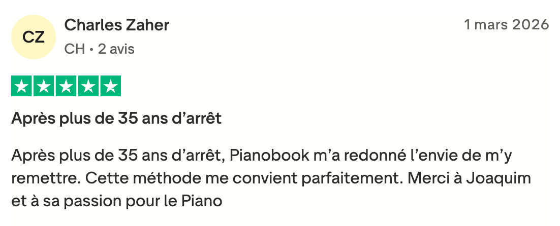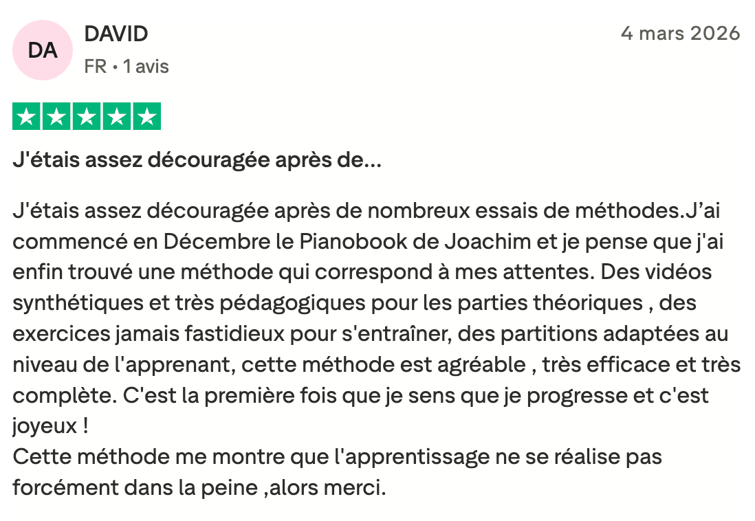 Avec l’accès complet à Pianobook, tu profites de l’intégralité du site et de tout ses contenus : les cours guidés, les vidéos explicatives, les partitions, les 50 morceaux avec leurs tutoriels pas à pas, ainsi que tous les cours sur la théorie et l’harmonie. Un accès illimité pour apprendre en toute liberté, à ton rythme, et te faire plaisir dès les premières notes.